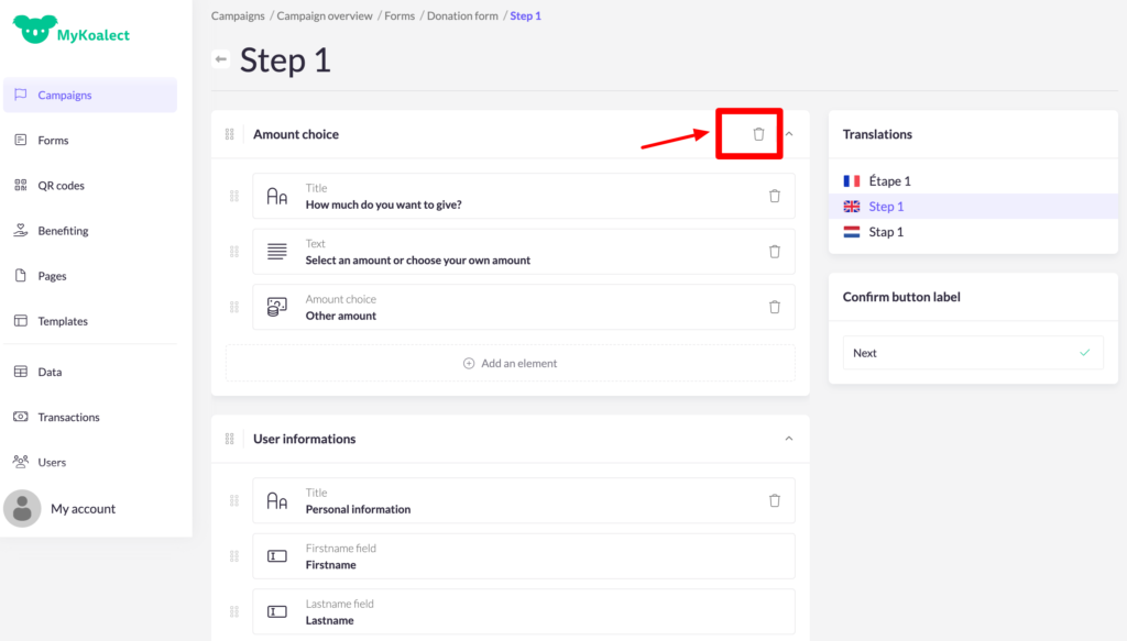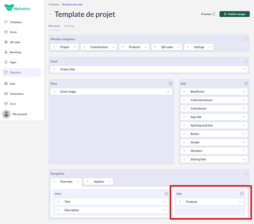 2. In order to make the products that project owners create visible on the project page, you will need to add as well the products element in the donation form in your campaign. You can do this by clicking on the block ‘forms’ > choose ‘contribution form’.