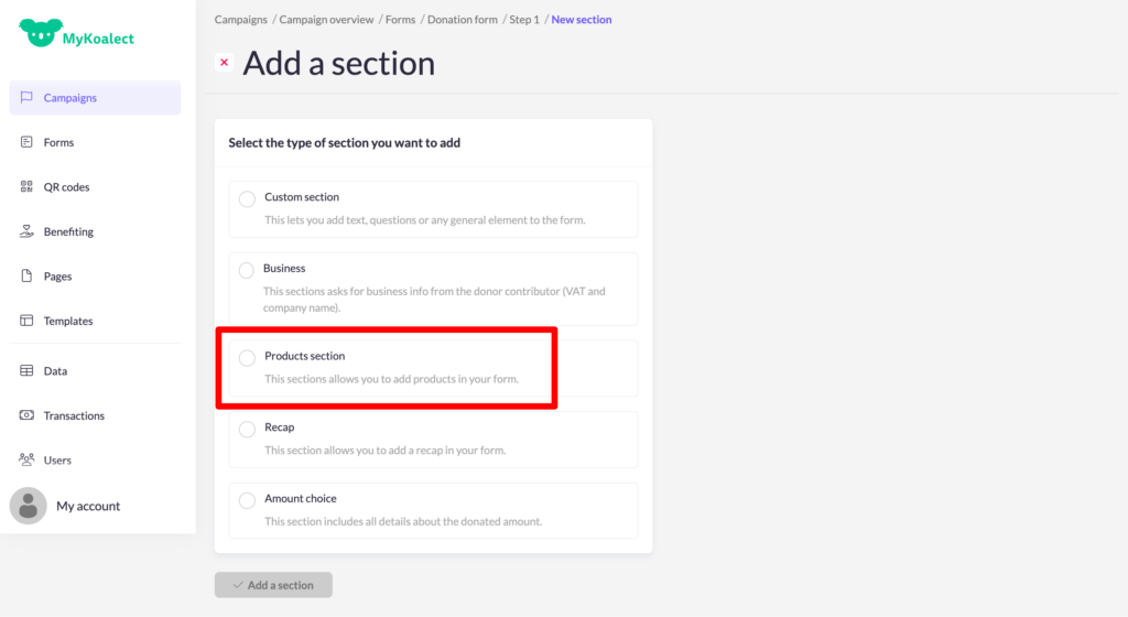 Tip: You can delete the ‘donation section’ of your form and add the ‘products section’ instead if your campaign revolves solely around product sales.