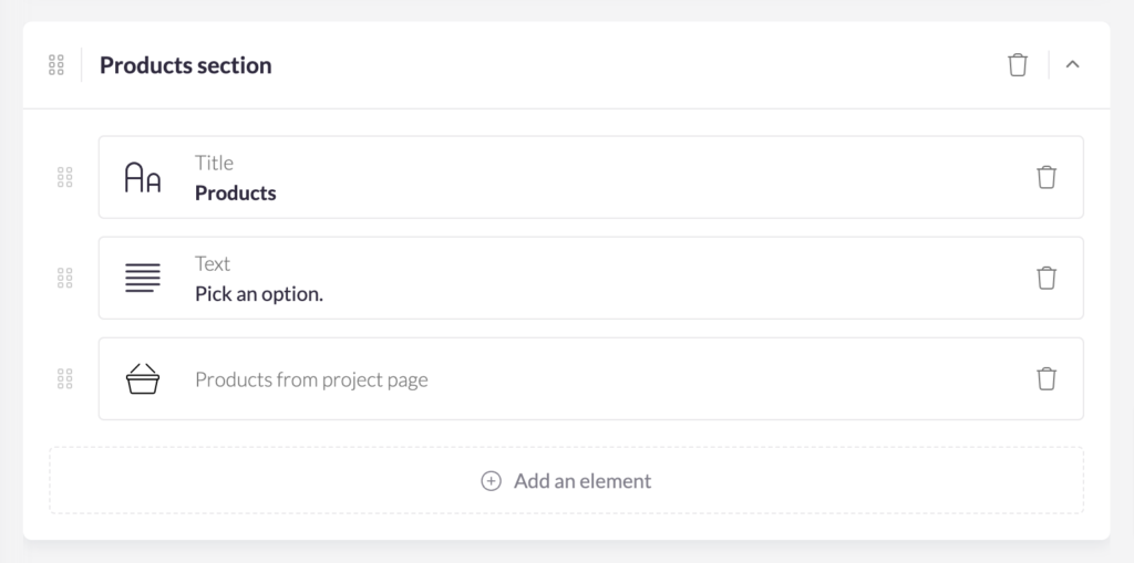 4. Replace the element ‘product selection’ by the new element ‘Products from project page’, like this: