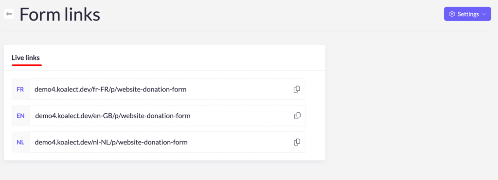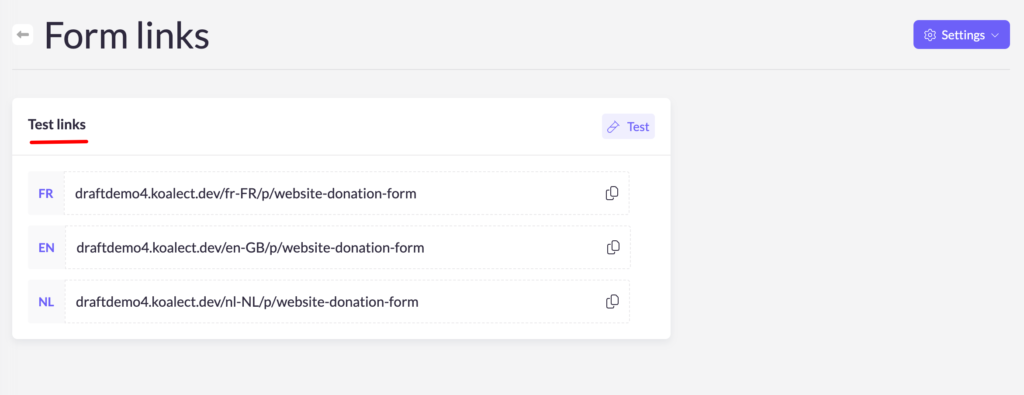 When the status of your form is set on ‘draft’, you can test and see your draft form via the Test link: