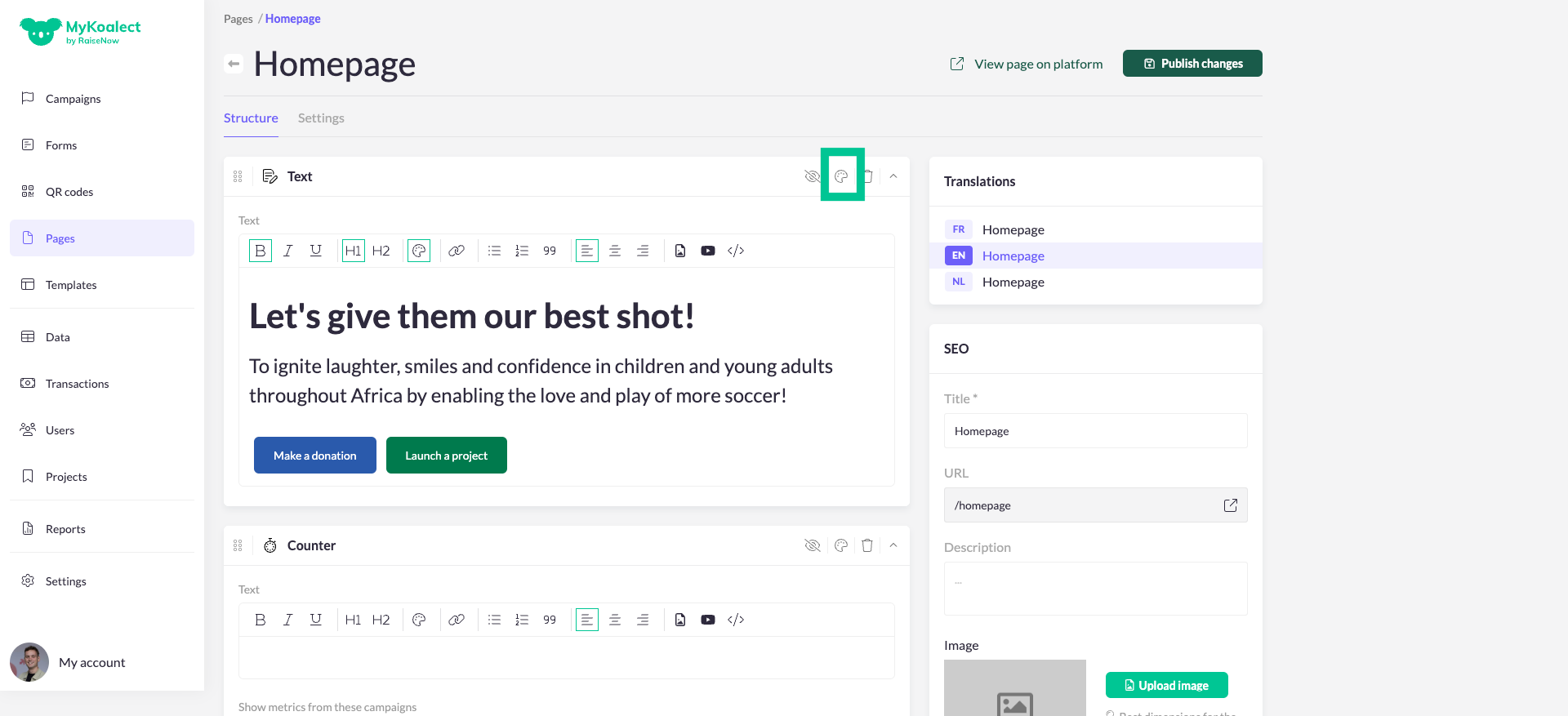 - To change section colors or background images, click on the painter’s palette icon in the right corner of the section.
