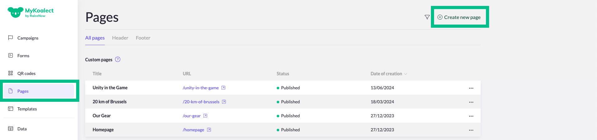 - Navigate to the “Pages” section in MyKoalect > Click “Create new page” and enter a title and description for your new page.
