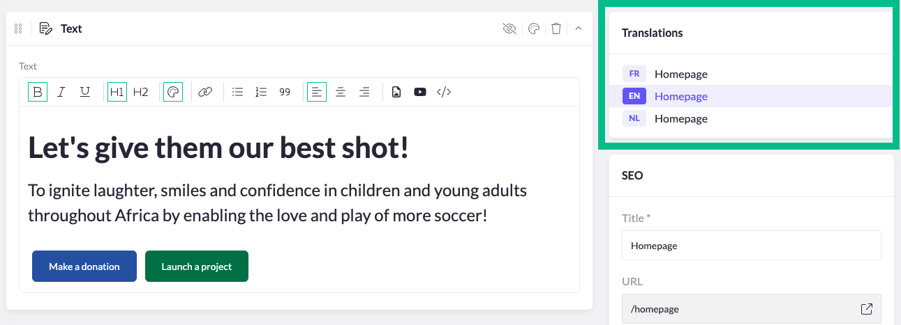 - Remember, all sections will appear in all supported languages, but content must be added separately for each language.