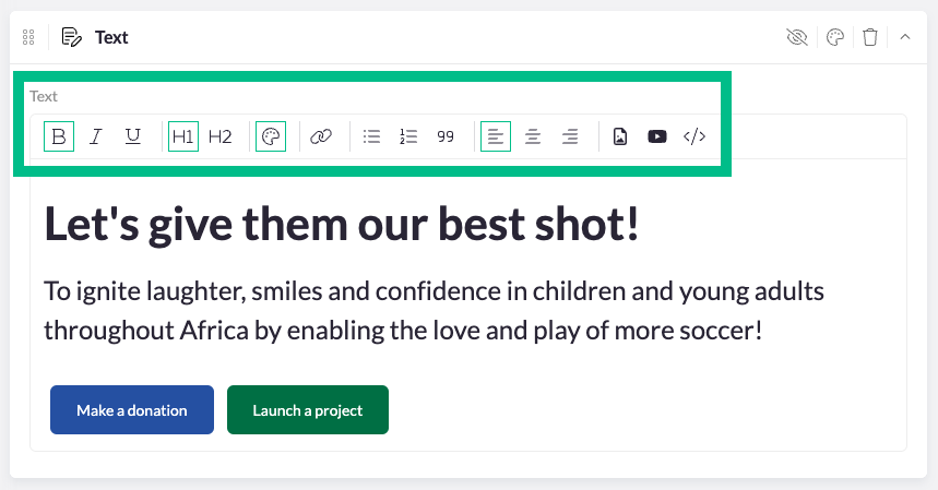 - Each section provides different ways to display text and buttons. Use the text editor to write your content.