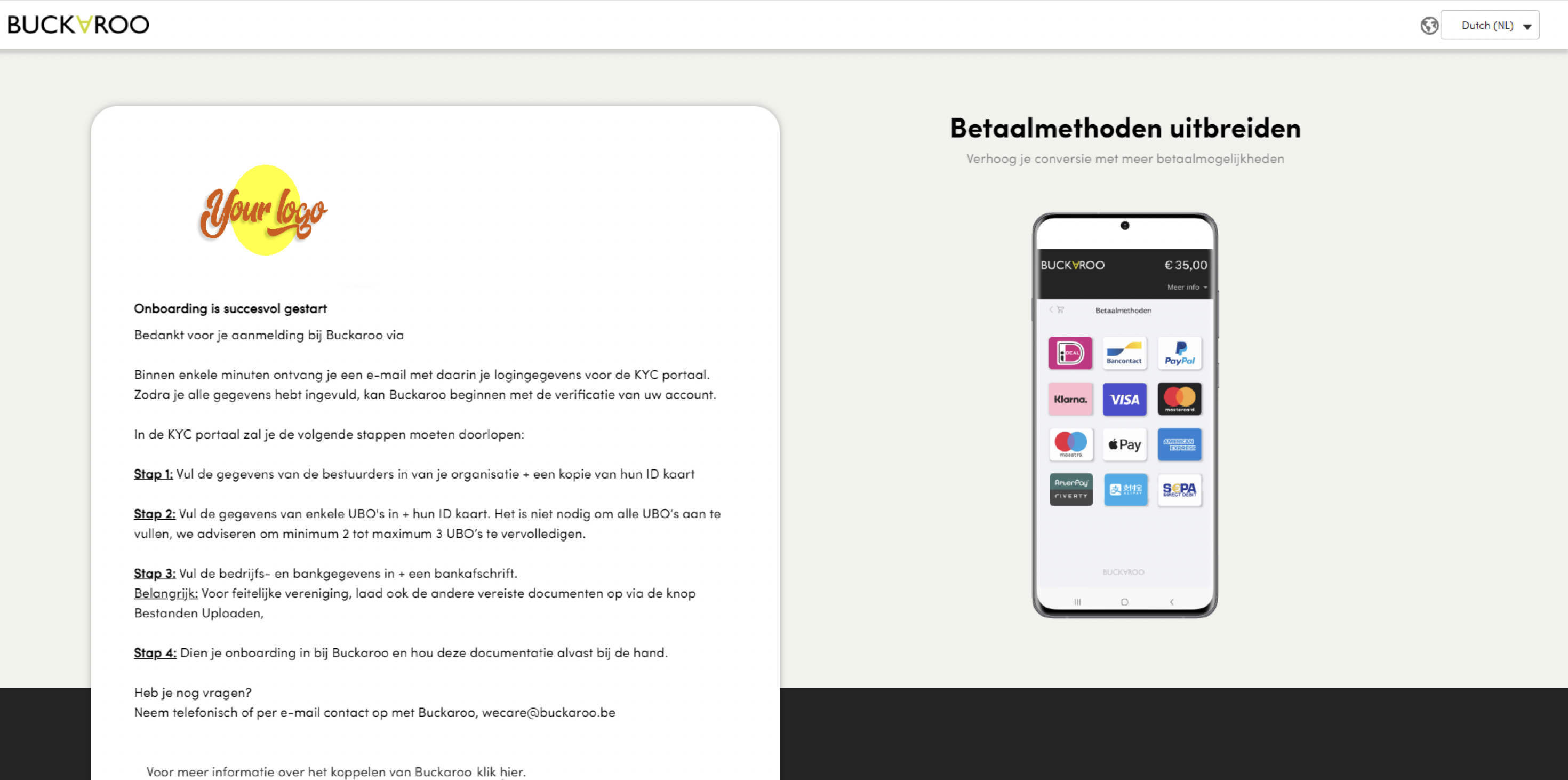 Now you’ve successfully started the onboarding at Buckaroo you are required to partake in a ‘KYC’ check. Know Your Customer, or KYC, is a requirement that banks and payment providers follow when a customer opens an account. It exists for security purposes to ensure that users are who they say they are and that the funds received won’t be used for money laundering, terrorism, or other illegal actions.