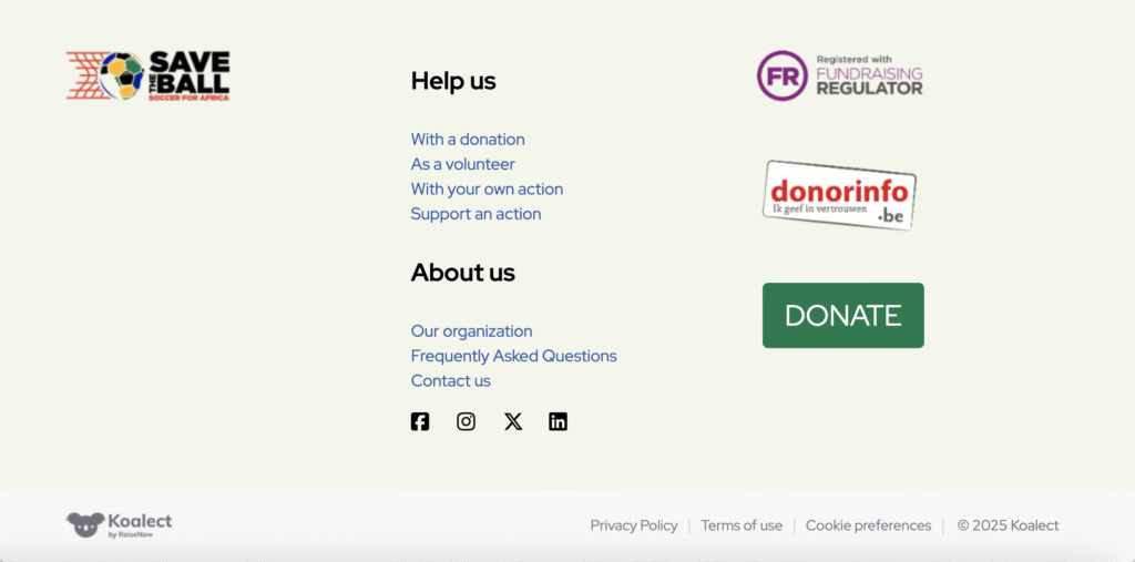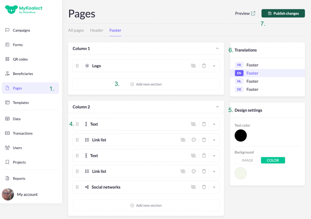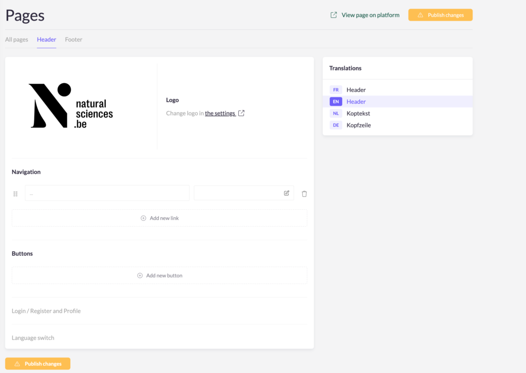 To link pages to your navigation menu’s in the header or footer, go to MyKoalect and click on “Pages” in the navigation column. Here you’ll find “Header” and “Footer in the top menu.
