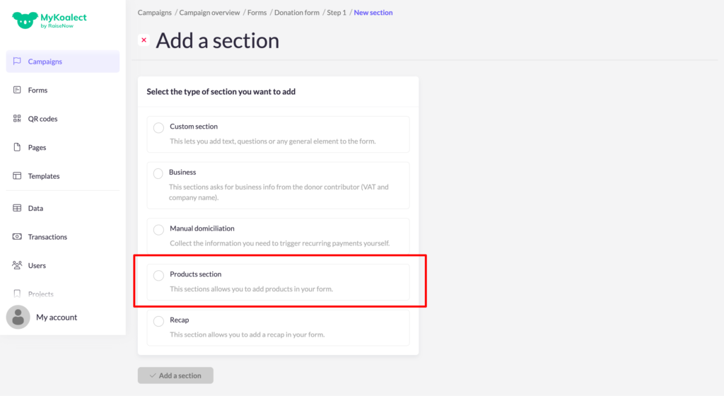 - Add a ‘section’ to the form. > Choose ‘Products section’.