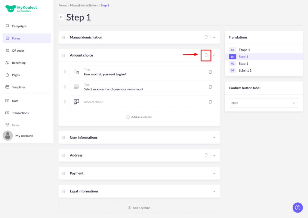 - Remove the ‘amount choice’ section from your form via the garbage bin: