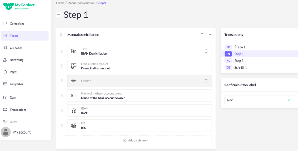 Does your organization prefer to manually activate domiciliations? If so, you will need the donor’s banking details (IBAN number and BIC) to initiate the monthly transactions. To gather this information, consider creating forms as shown below: