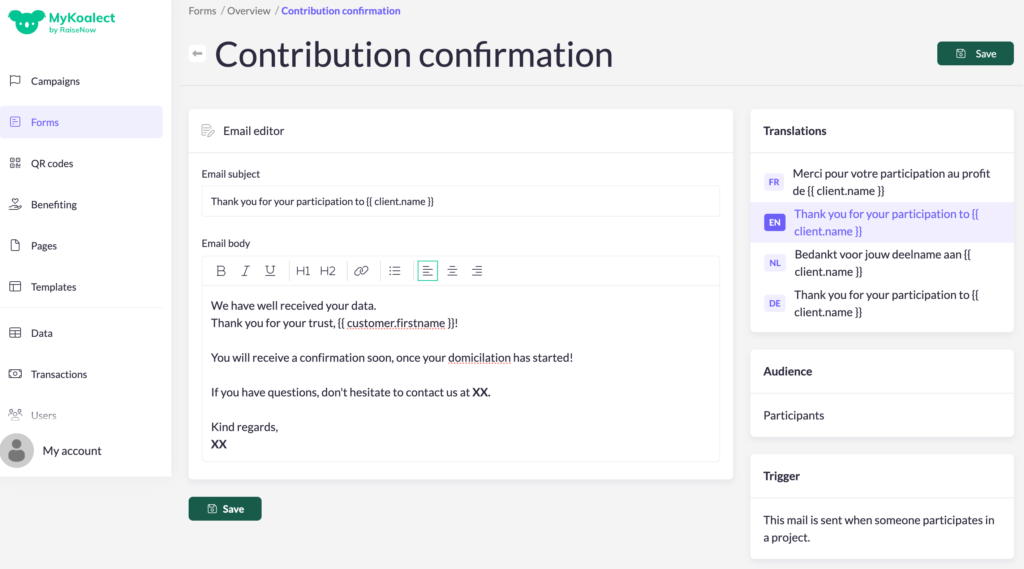 - Personalise the confirmation e-mail to inform the donor that the manual domiciliation will be installed soon.