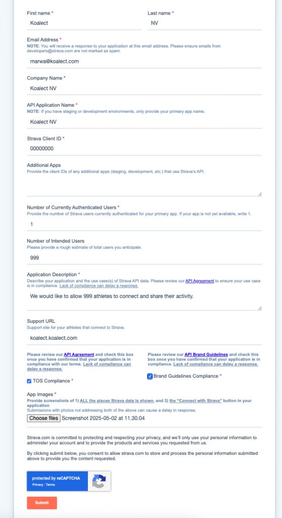 - Fill in the STRAVA API program submission form