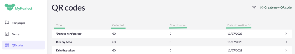 - ‘Collected’: Amount of money collected with this QR code.