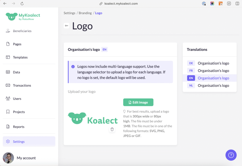 TIP: It’s also possible to upload different logo versions for each language. This way, you can adapt to language-specific visuals, taglines, or legal requirements.