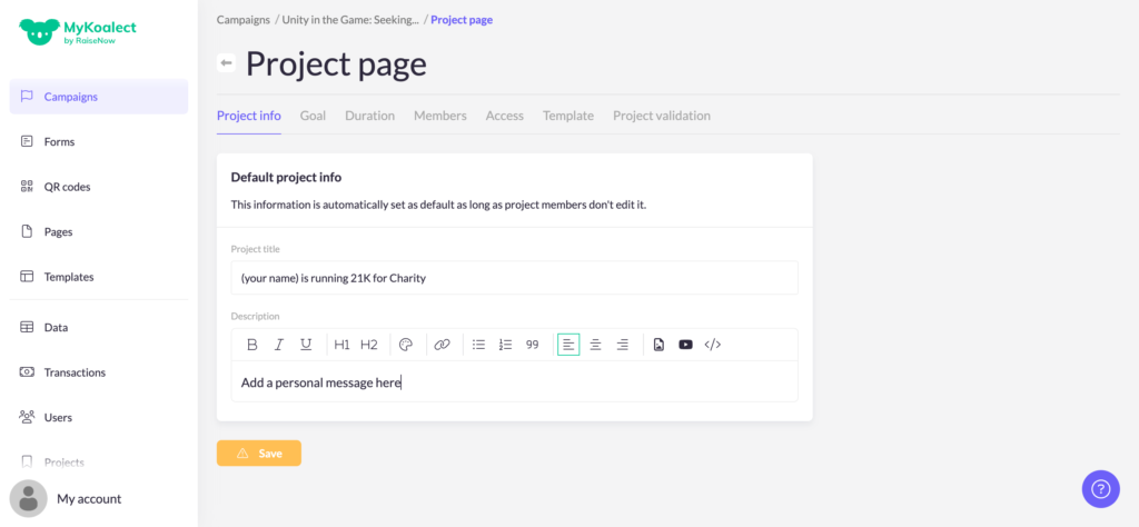 For every campaign your supporters can create their own project page to collect funds for your organisation. The supporter can make their project page personal.