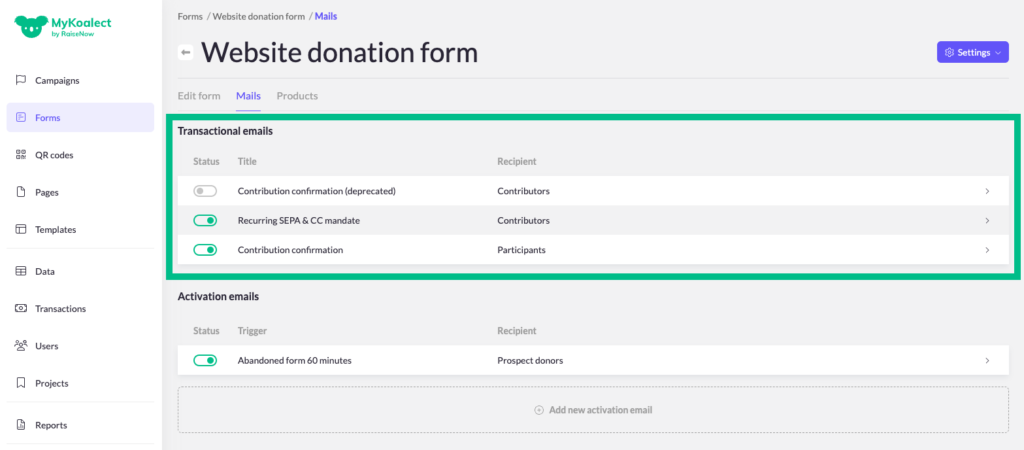 You can enable or disable these mails based on your preference, which include pre-set default messages that can be personalised to give your donor journey a personal touch to make it more engaging.