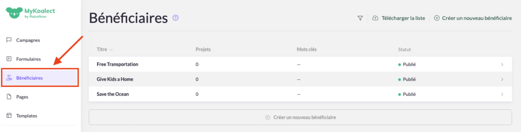 Une fois cette fonctionnalité activée vous pourrez trouver un onglet supplémentaire intitulé « Bénéficiaires » dans MyKoalect :