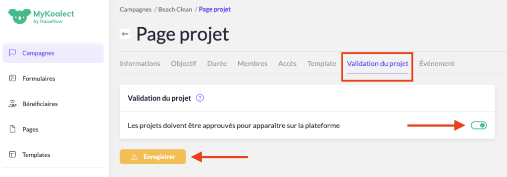 3. Activez la validation du projet pour la campagne sélectionnée et enregistrez vos modifications.