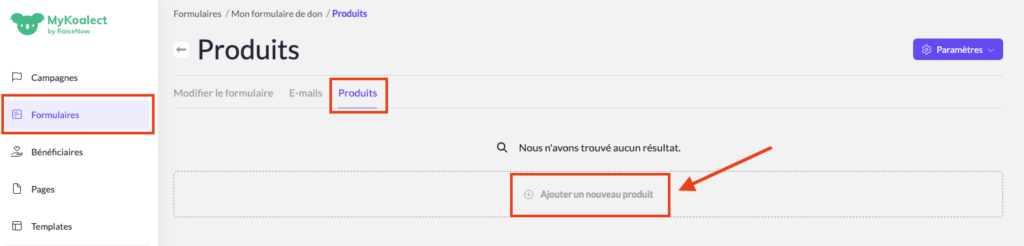 Veuillez suivre les instructions ci-dessous pour pouvoir proposer des produits à vos contributeurs, par exemple des crêpes ou des billets pour vos événements.
