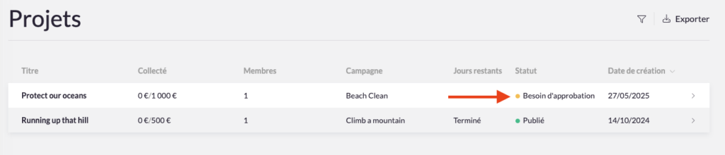 3. Chaque projet a un statut spécifique. Si le statut d’un projet est marqué « Besoin d’approbation », l’administrateur a la possibilité de le vérifier et de le valider.