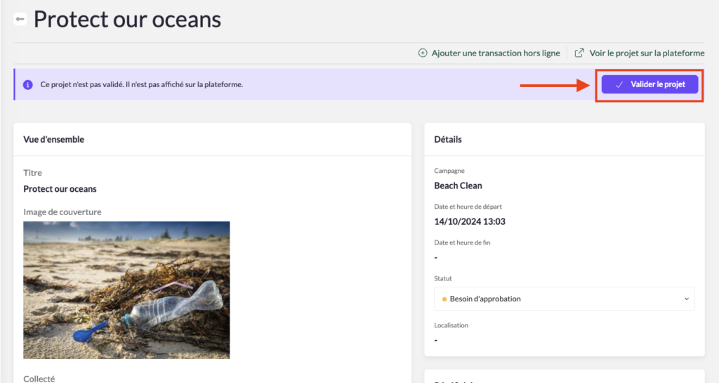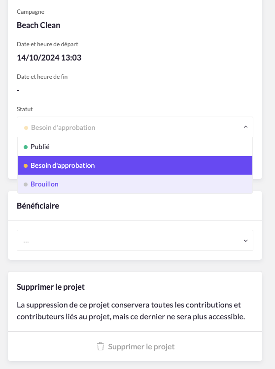 Remarque : vous pouvez choisir de supprimer un projet ou de le mettre en mode brouillon s’il ne respecte pas les règles de votre campagne et ne peut donc pas être validé. Dans ce cas, vous devez également contacter la personne concernée et lui fournir les raisons concernant votre décision.