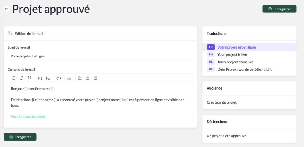 Vous pouvez activer/désactiver ou modifier l’e-mail envoyé au responsable du projet dans la section « E-mails » de votre campagne :
