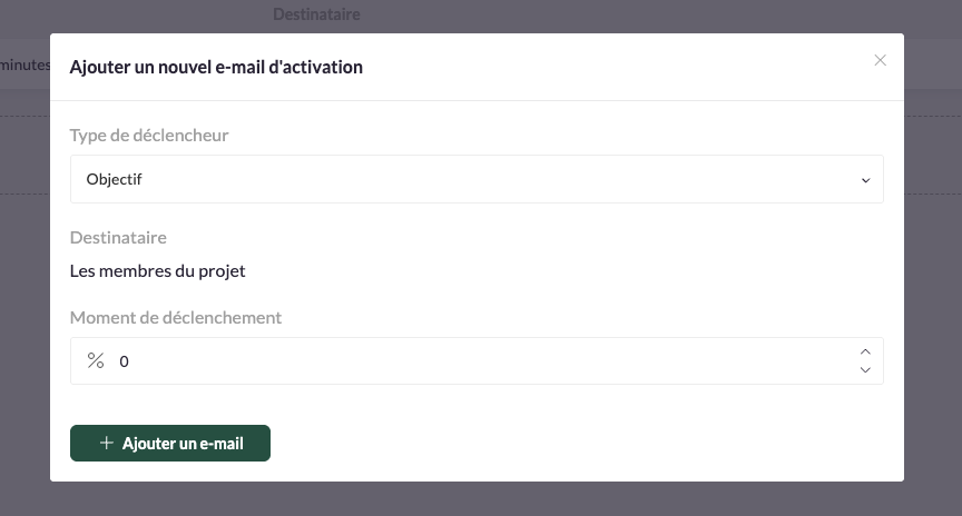 Vous avez la possibilité d’envoyer automatiquement un e-mail d’activation aux responsables de vos projets à une date spécifique ou après une étape en particulier. Ces e-mails servent de rappel ou d’incitation à passer à l’action, ce qui vous permet de rester en contact étroit avec eux.