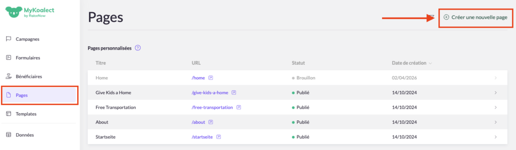 1. Cliquez sur l’onglet « Pages » puis « Créer une nouvelle page » en haut à droite.