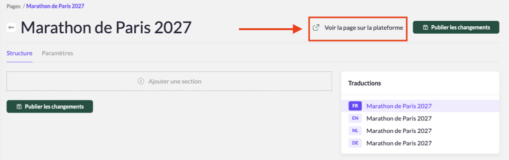 5. Cliquez sur « Publier les changements » pour enregistrer vos modifications. Vous pouvez afficher votre page actuelle en cliquant sur « Voir la page sur la plateforme » en haut à droite.