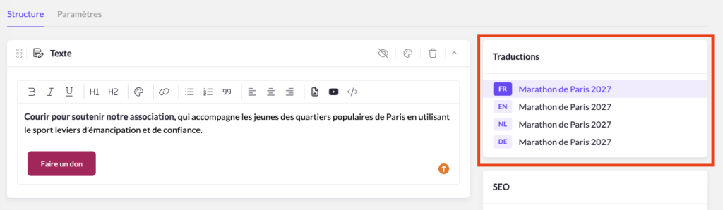 • Les sections s’affichent dans toutes les langues disponibles, cependant vous devez traduire vous-même le contenu pour chaque langue.
