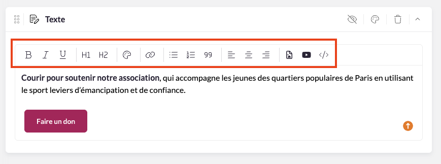 • Chaque section propose différentes façons d’afficher du texte et des boutons. Utilisez l’éditeur de texte pour rédiger votre contenu.
