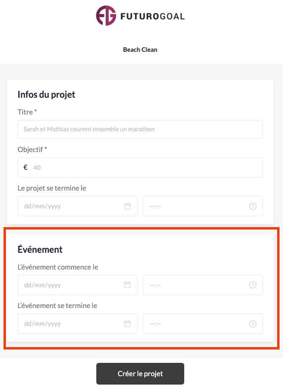 - Les dates des événements sont purement indicatives : elles indiquent quand l’événement a lieu, mais n’ont aucune influence sur la période de collecte de fonds.