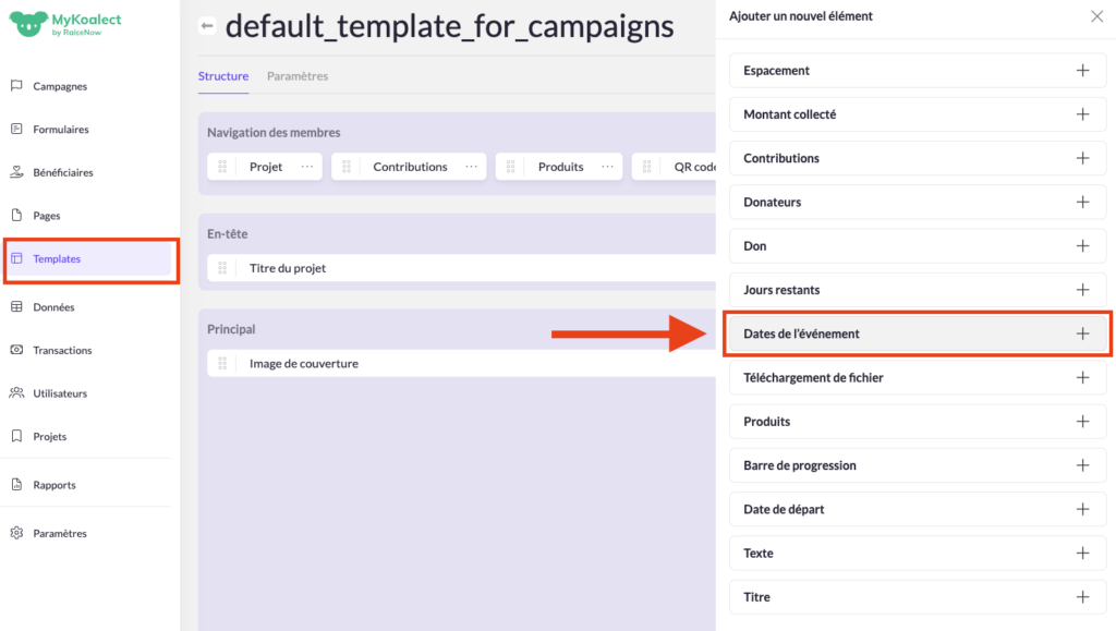 Pour permettre aux utilisateurs d’indiquer la date de leur événement, vous devez ajouter les champs relatifs aux dates de l’événement à votre formulaire de création de projet.