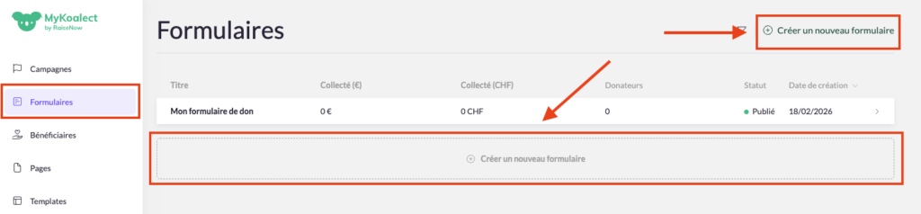 1. Cliquez sur « Formulaires » puis sur « Créer un nouveau formulaire » en haut à droite ou au milieu en bas.