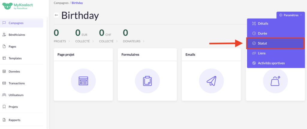 Après avoir créé une nouvelle campagne, vous pouvez la rendre visible sur votre plateforme, permettant ainsi aux utilisateurs d’y contribuer en créant leurs projets. Pour activer vos campagnes et les rendre visibles sur votre plateforme vous devez suivre ces deux étapes :