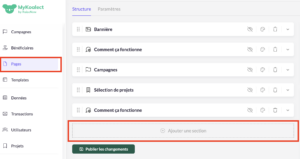 - Dans « Structure » cliquez en bas sur « Ajouter une section » et sélectionnez « Campagnes ».