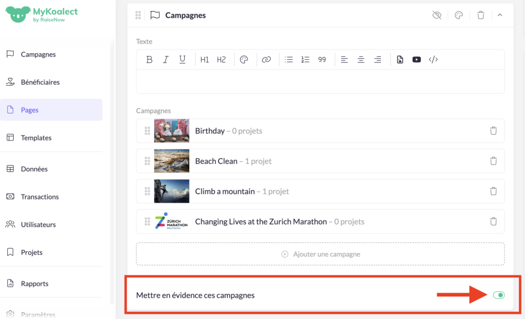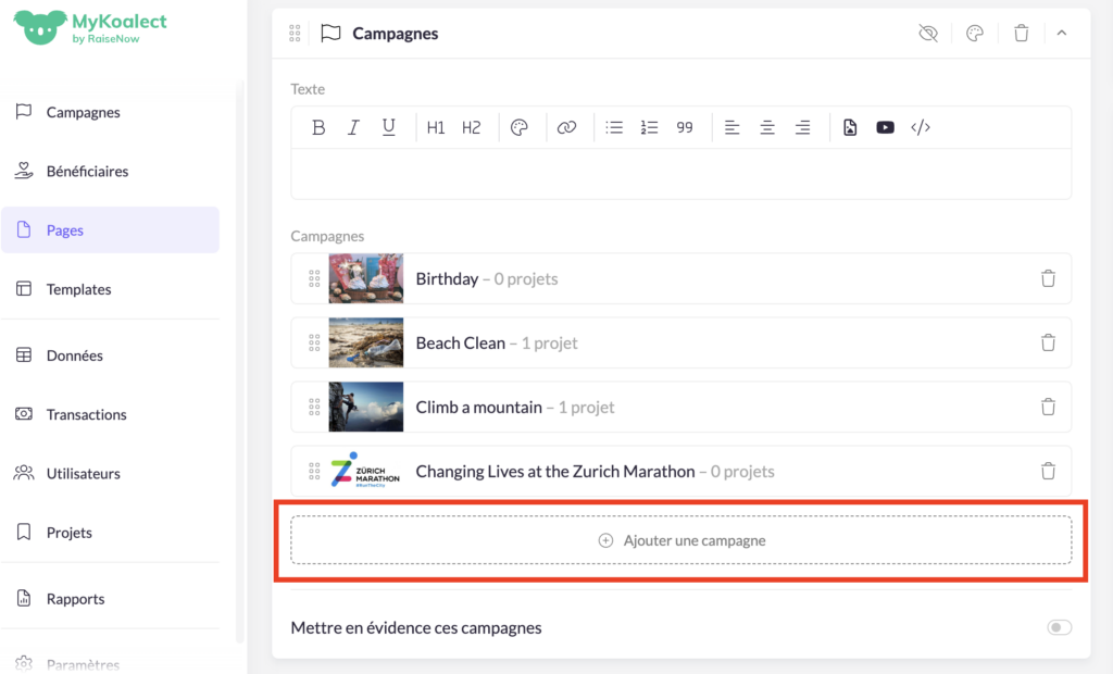 2. Ajouter la « section Campagne » sur une page de votre plateforme :