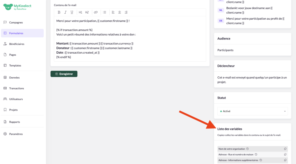 Lorsque vous modifiez un e-mail vous pouvez utiliser les variables proposées sous « Liste des variables » en bas à droite, pour le personnaliser encore plus.