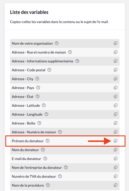 - Accédez à la liste des variables et cliquez sur le petit symbole à droite de celle que vous souhaitez utiliser dans votre e-mail.